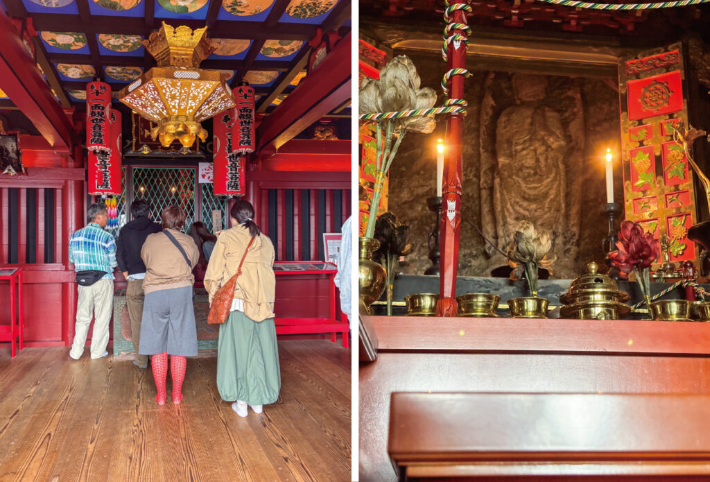 観音堂には、船形山の崖面中段に彫られた十一面観世音菩薩の磨崖仏(まがいぶつ)が祀られており、歴史と信仰を感じる荘厳な空気に包まれていました。
