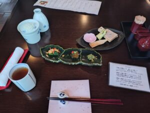 最初に出てきたのは、サービスの3点盛りとそばつゆと山葵です。