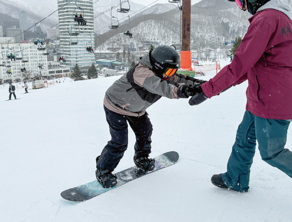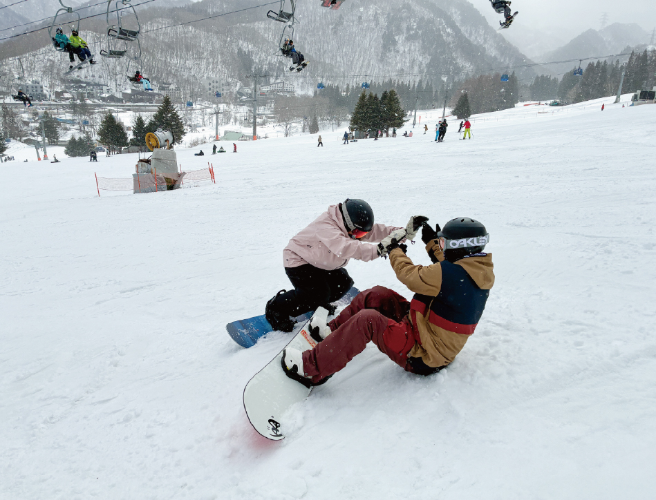 スキーやスノーボードが得意な人が、滑れない人をサポートしてくれたり、アドバイスをくれたり。