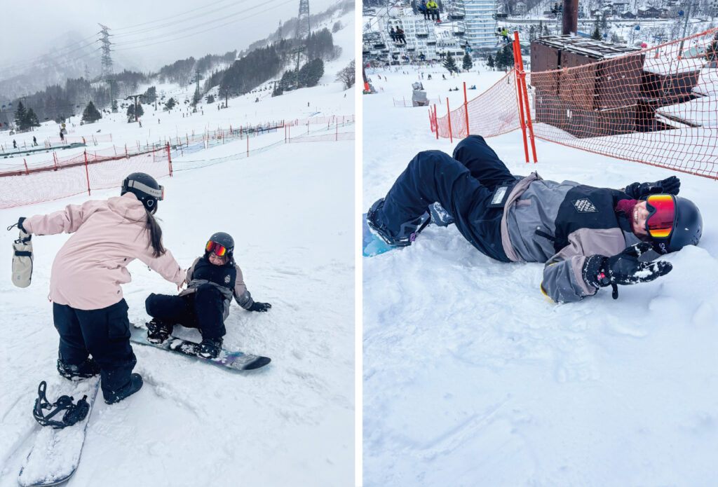 今回、初めてスノーボードに挑戦するスタッフ2名はレッスンへ🏂