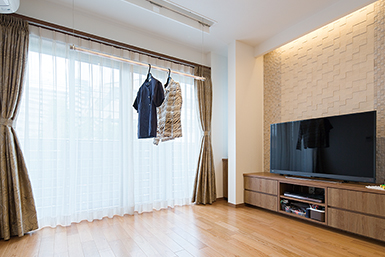 雨天時などにバルコニーから洗濯物をとりこみ、室内にすぐ干せるのが嬉しい空間です。