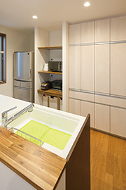奥様の要望で対面式キッチンを採用したLDK。扉を設けた背面収納、キッチン家電を縦にすっきり置ける棚の下にはゴミ箱スペースを。リビング側から見えないのがポイント。造作したTV台の上には間接照明を入れています。